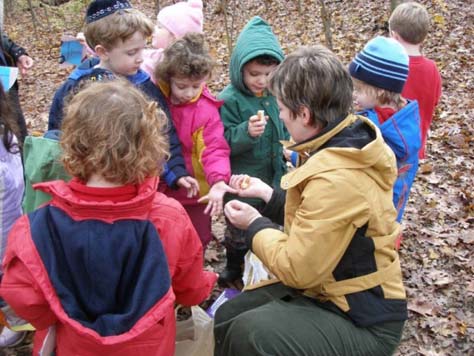 The teacher takes the kids out into the woods or the playground to