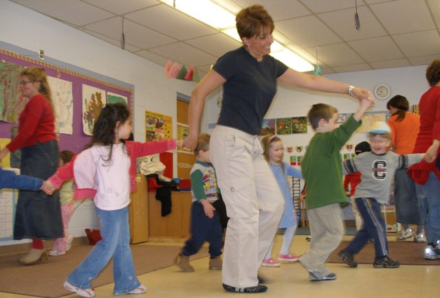 circle, or snake around the room in happy response to lively Israeli